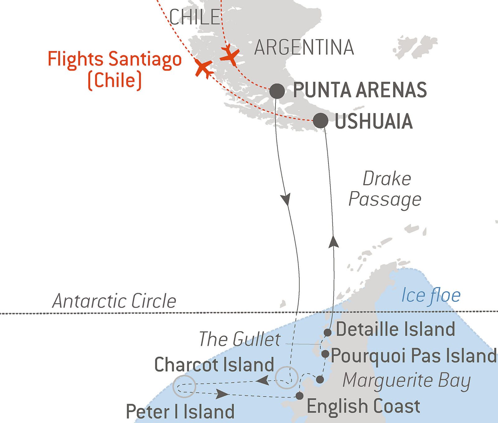 - Airport transfer from Santiago to Airport and from Ushuaia pier to airport